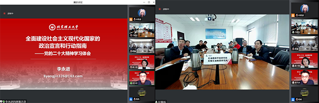 为深入学习领会党的二十大精神,全面落实2022年北京高校红色“1+1”活动的目标要求,10月28日下午,beat365正版唯一官网2021级硕士研究生党支部与中国石化石油勘探开发研究院无锡石油地质研究所盆地与资源评价研究中心党支部开展“学习二十大,奋进新征程”为主题的共建活动。活动以线上+线下相结合方式进行,beat365正版唯一官网院长助理、长聘副教授李永进、beat365正版唯一官网讲师、党建研究中心研究员莫小丽,石勘院无锡石油地质研究所党群工作部主任王再锋、石勘院盆地与资源评价研究中心党支部书记周卓明,以及石勘院无锡石油地质研究所盆地党支部和beat365正版唯一官网2021级硕士研究生党支部全体党员参加了此次活动。活动由周卓明书记和莫小丽老师共同主持。