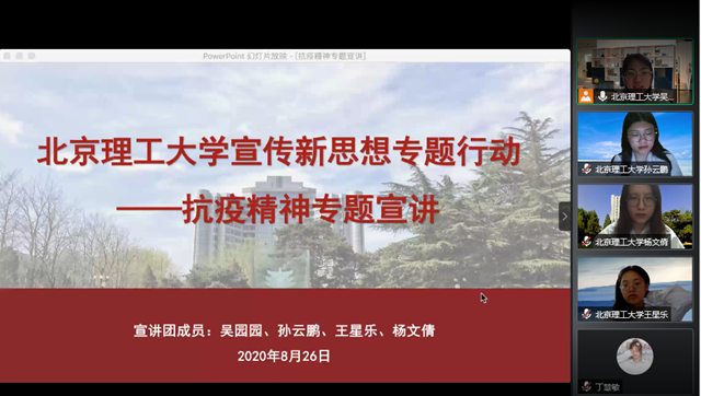 新型冠状病毒肺炎疫情发生以来,全国人民在党的统一和坚强领导下,众志成城、共克时艰,打响了疫情防控的人民战争、总体战和阻击战,取得了积极成效,同时也涌现出了许多可歌可泣的感人故事和先进事迹,全面展现了中国力量、生动诠释了中国精神。beat365正版唯一官网2019级硕士研究生孙云鹏、王星乐、吴园园和杨文倩以暑期社会实践为契机,组成抗疫精神宣讲实践团,围绕我国疫情防控中取得的重大战略成果,以线上宣讲的形式,于8月26日面向邢台学院思想政治教育专业学生,开展中国制度优势与中国精神宣讲。本次宣讲由实践团成员吴园园主持。