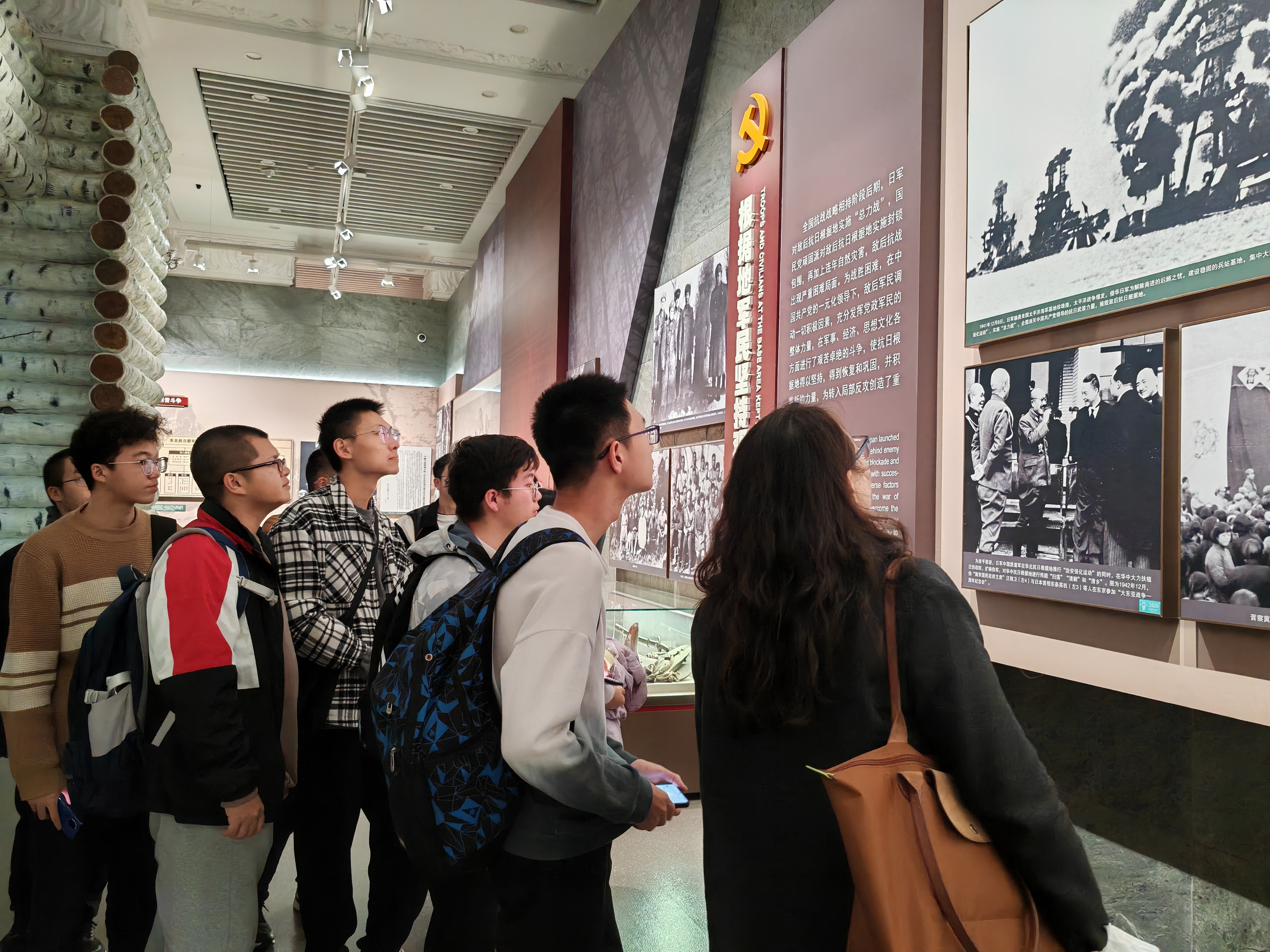 实践教学第二模块老师与同学们前往博物馆二楼展厅参观《抗日战争馆》,了解中国共产党领导中国人民进行抗日战争艰苦卓绝的历史。在参观过程中,学生们被各种珍贵的文物实物、照片、视频短片和历史景观重现所吸引。他们认真观看每一件展品,仿佛穿越时空,回到了那段烽火连天的岁月,亲身感受到了革命先烈的英勇事迹和无私奉献精神。