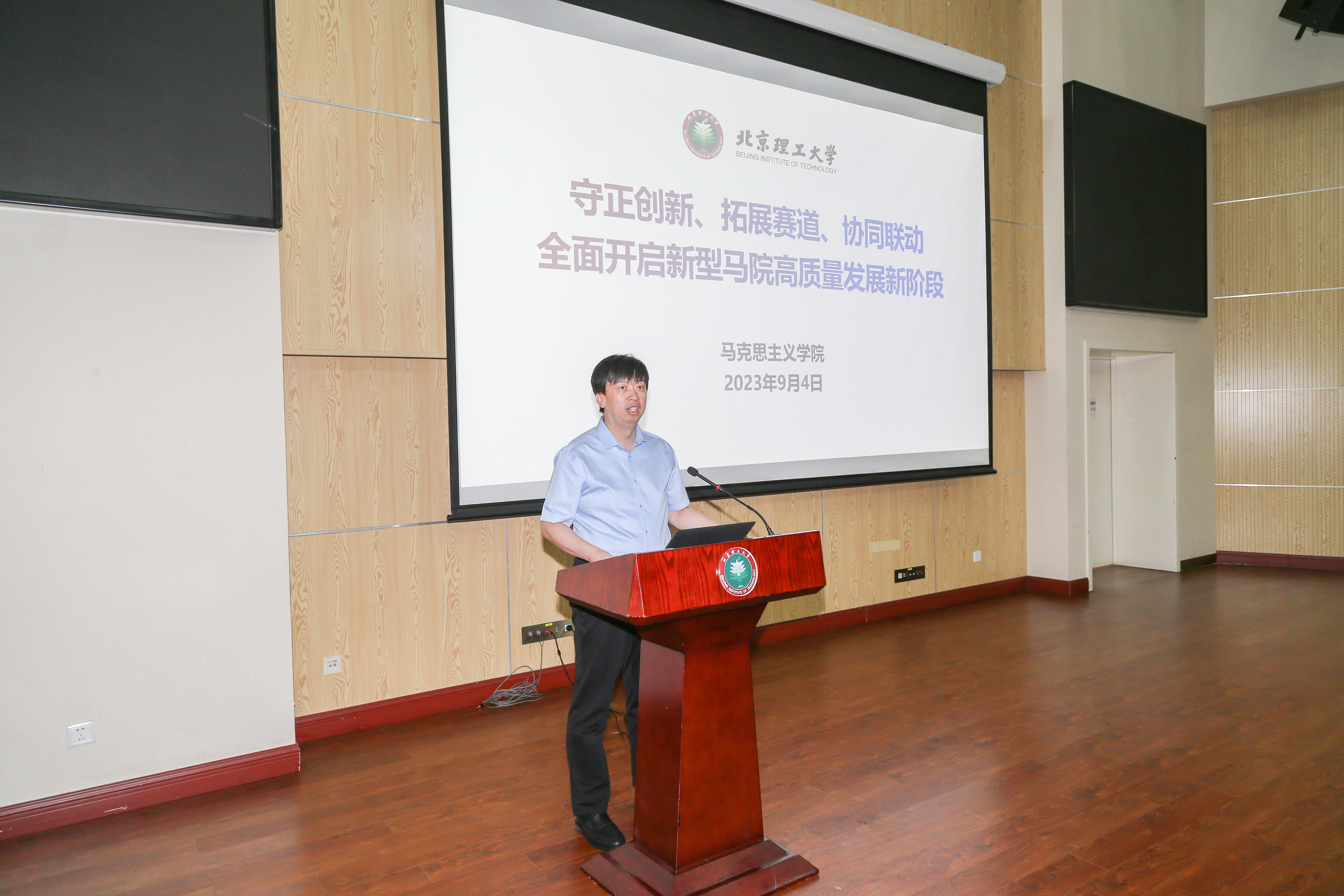 会议首先由刘新刚院长做题为《守正创新、拓展赛道、协同联动 全面开启新型马院高质量发展新阶段》的工作报告。刘新刚对学院新阶段建设形势和目标进行了科学研判,对学院上半年工作进行了回顾总结,对下半年工作进行了部署。